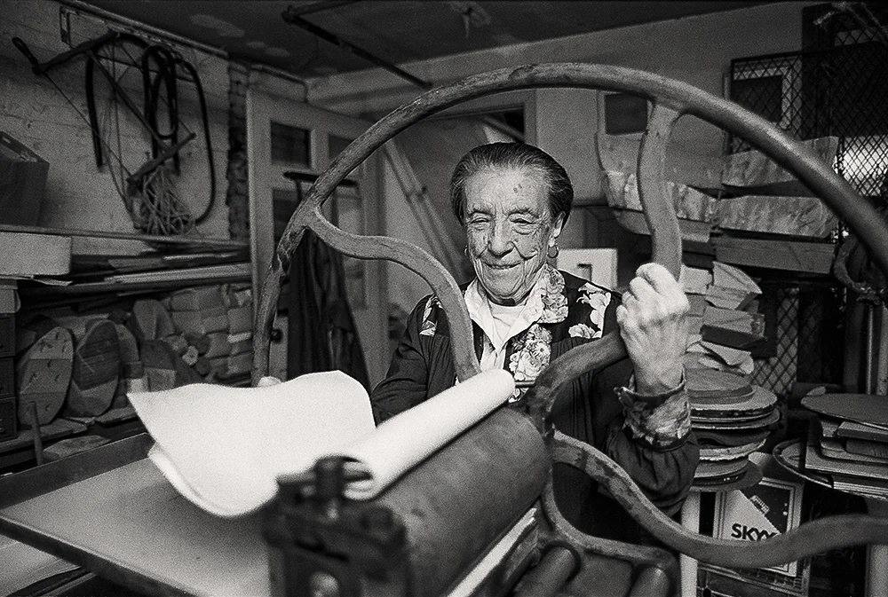Louise Bourgeois at the printing press in the lower level of her home/studio on 20th Street, New York, 1995. Photograph by and © Mathias Johansson